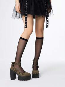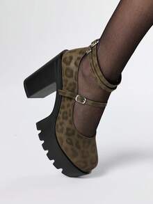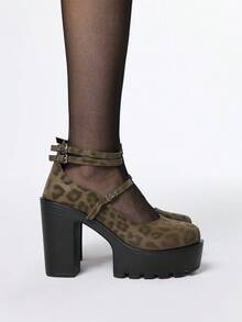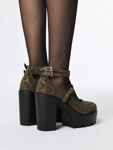 Kawaii Women's Leopard Print Closed Toe Chunky Heel Mary Jane Pumps With Ankle Strap, Waterproof Platform Party Dress Shoes