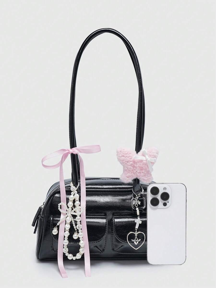 Kawaii Women's Retro Cute Plaid Bowknot Detail Cherry Heart Decor Shoulder Armpit Bag, Multi-Pockets Boston Handbag