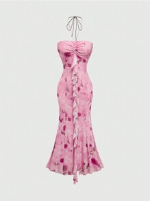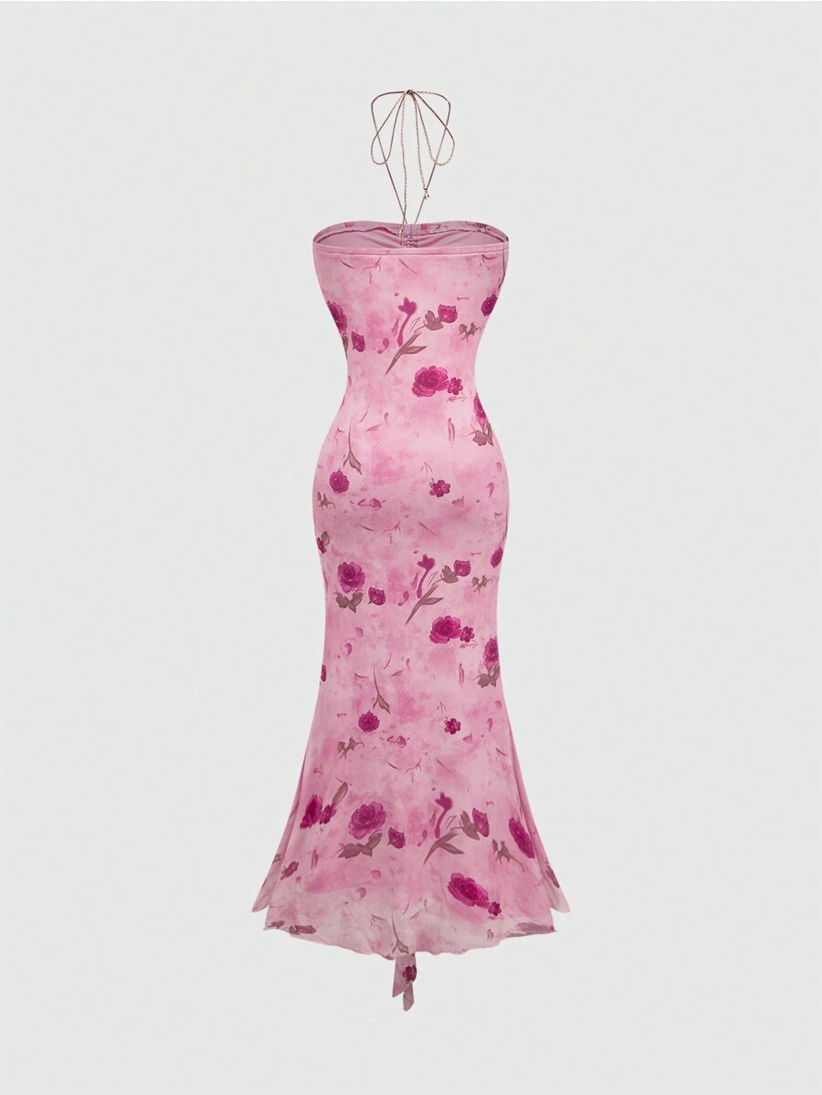 Kawaii Women's Romantic Rose Floral Mesh Print Mermaid Hem Elegant Dress, Valentine's Day