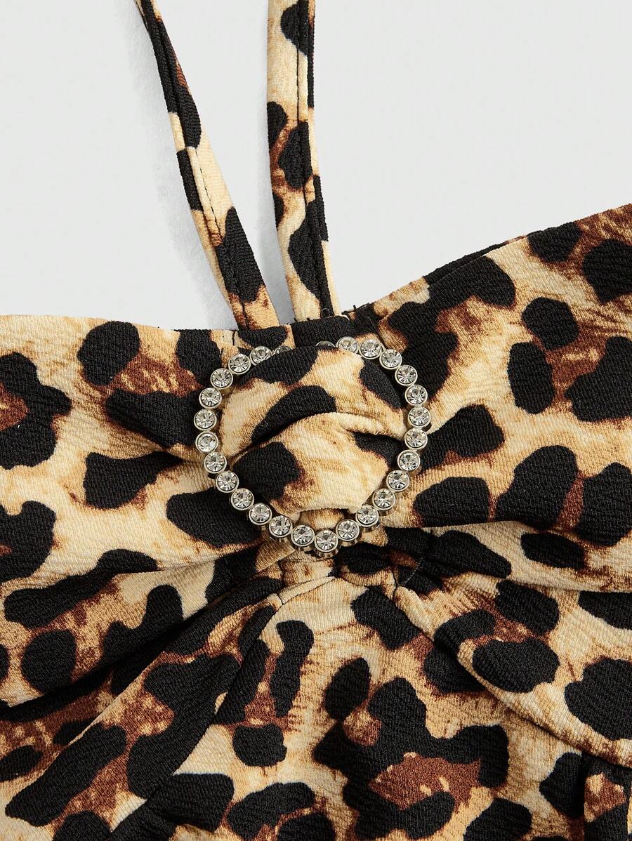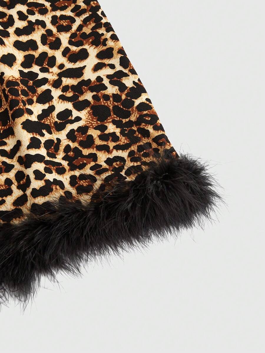 Kawaii Women's Summer Fashion Leopard Print Splice Fluffy Trimmed Backless Halter Neck Dress