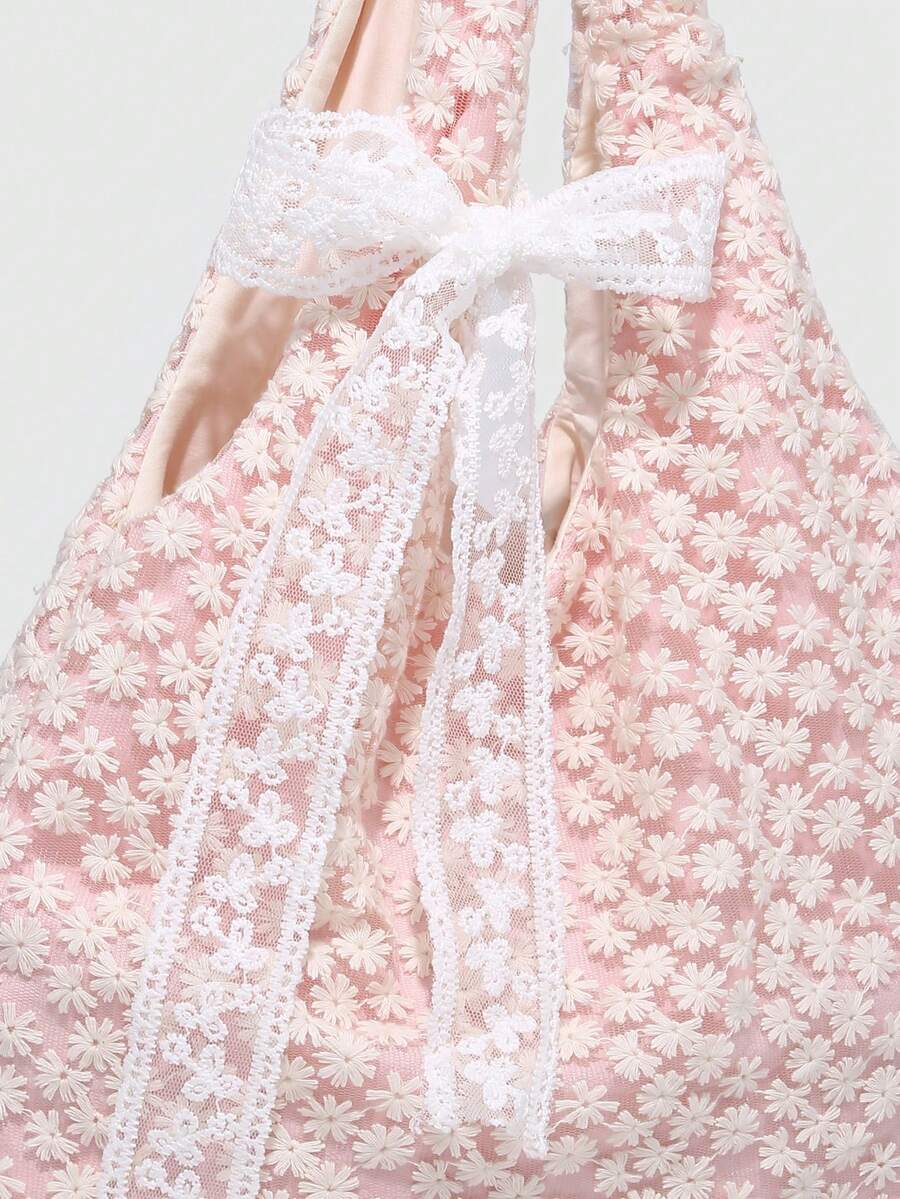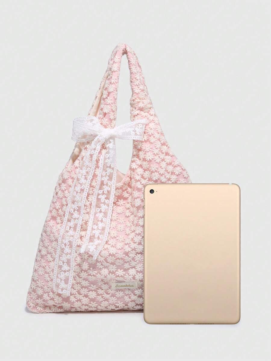 Kawaii Women's Vintage Style Vacation Netted Ruffle Bow Decor Large Capacity Tote Bag