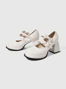 Kawaii Women's White Closed Toe Chunky Heel Platform Bow Dress Shoes, Sexy Loafers Mary Jane Flats For Formal Work Office Wear