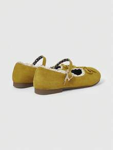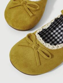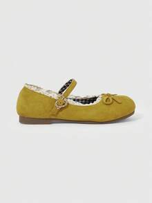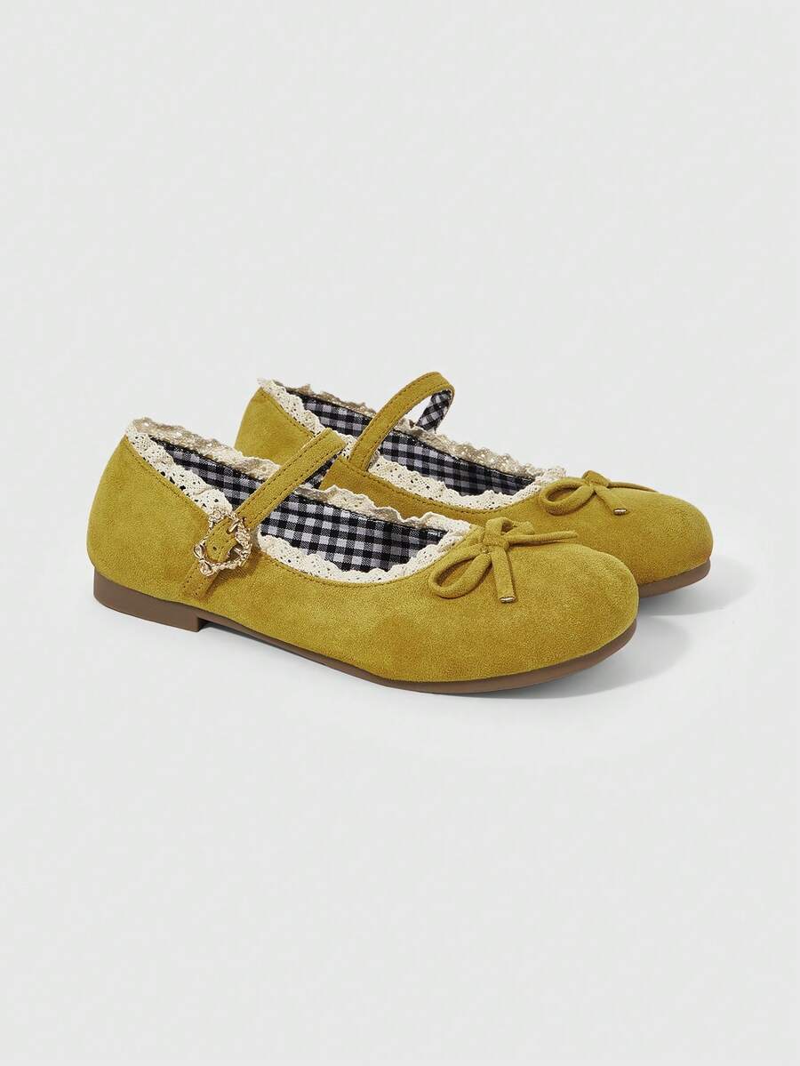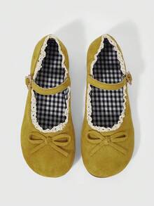 Kawaii Women's Yellow Mary Jane Shoes, Closed Toe, Lolita Style Flats With Bow, Lace, Ballet Flats