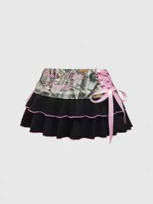 Kawaii Y2K Baddie Camo Embroidered Ruffle Hem Skater Skirt, Plus Size