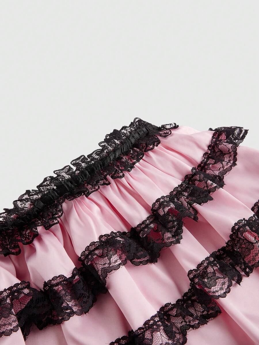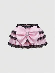 Kawaii Y2K Himekaji Gyaru Sweet Pink Puff Skirt With Lace Patchwork And Oversized Bow Back Design, Low Waist Ladies Mini Skirt