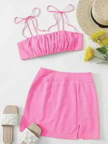 Knot Shoulder Tie Back Ruched Bust Crop Cami Top & Split Hem Skirt Set