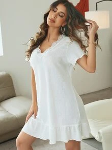 Lace Trim V-neck Ruffle Hem Waffle Knit Nightdress