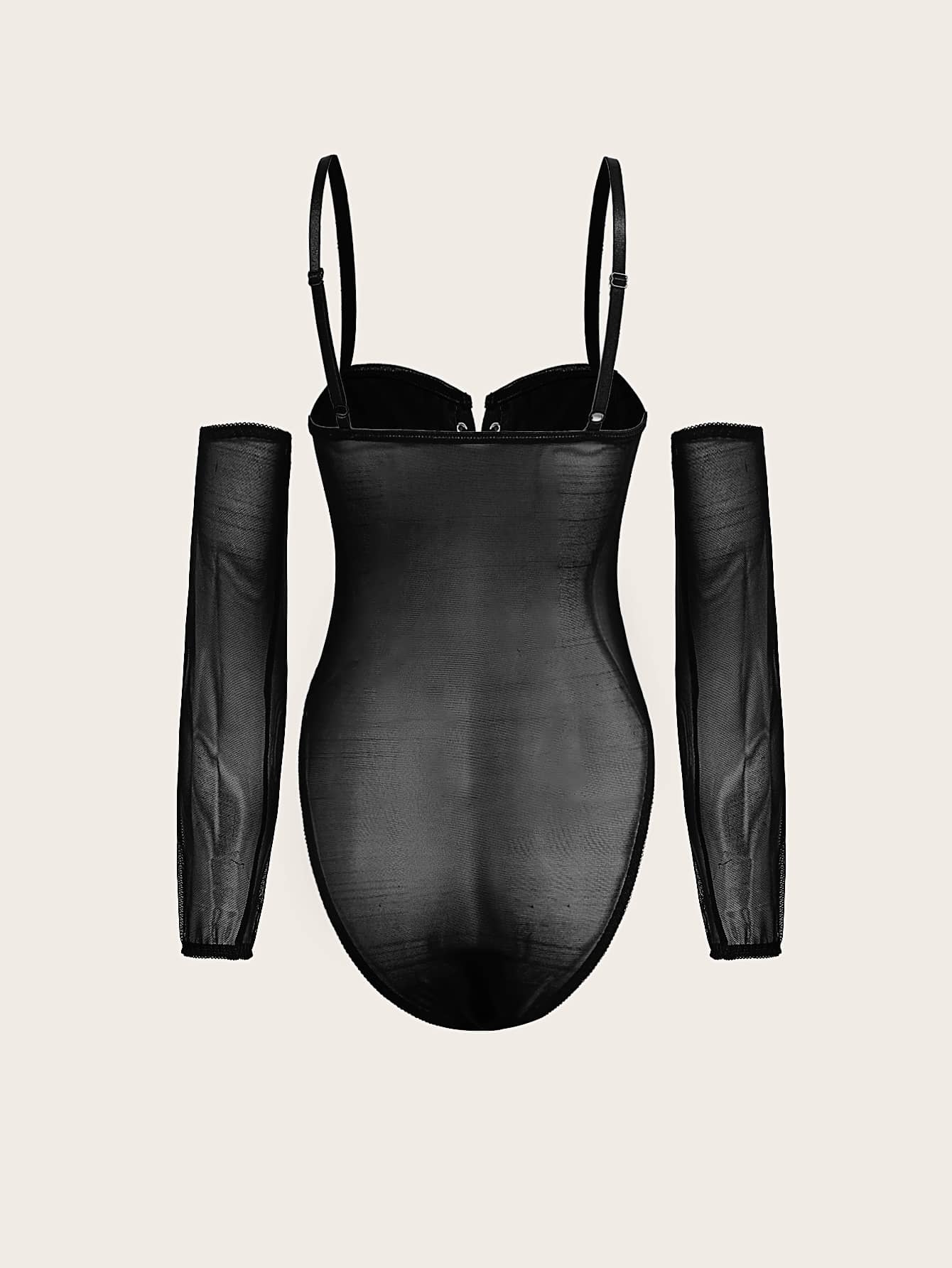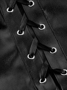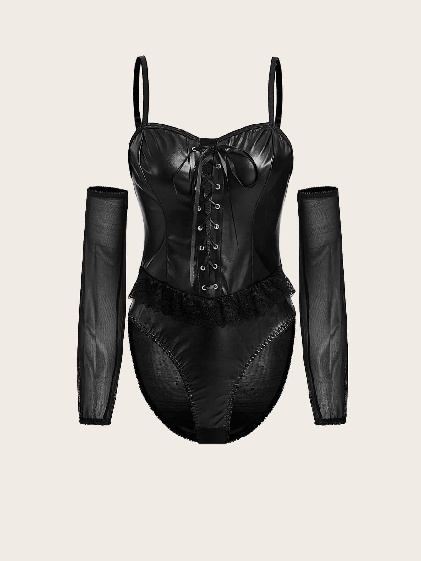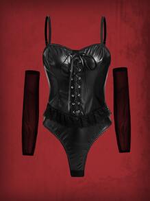 Grunge Punk Lace Up Front Ruffle Trim PU Cami Bodysuit With 1pair Oversleeves