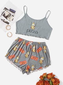 Letter & Cartoon Graphic Lettuce Trim Cami PJ Set