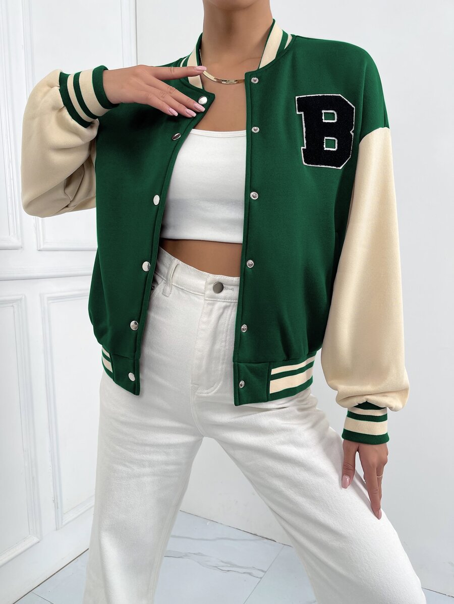 Letter Patched Striped Trim Drop Shoulder Varsity Jacket