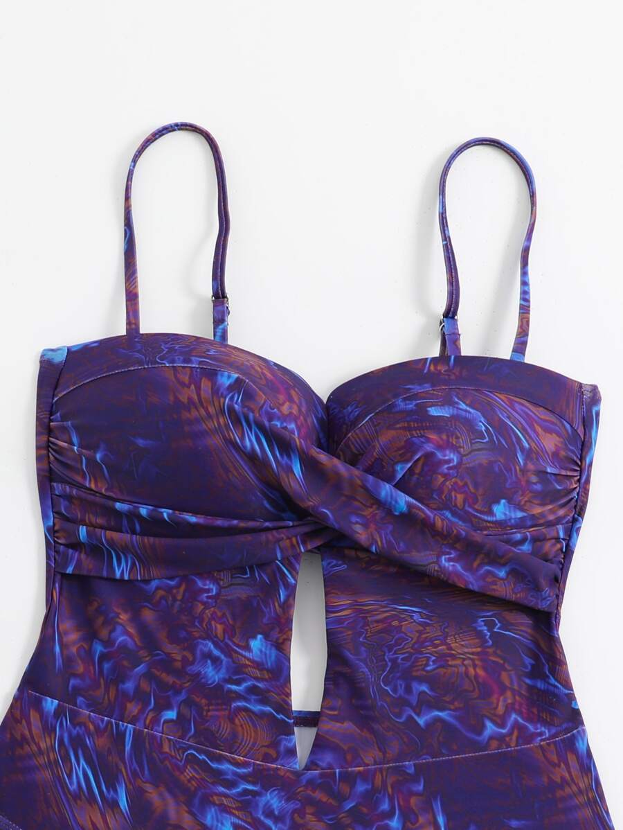 Marble Print Twist Front Cut Out One Piece Swimsuit, For Summer Beach Vacation