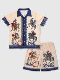 Street Life 2pcs Men's Knight Print Short Sleeve Shirt And Shorts Casual Set