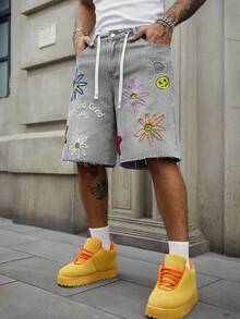 Street Life Men's Casual Everyday Floral Embroidery Pocket Denim Shorts