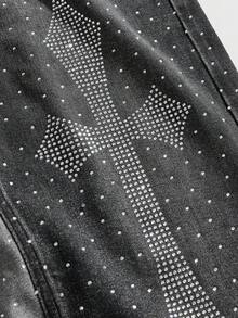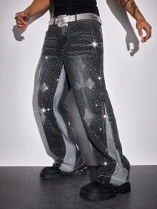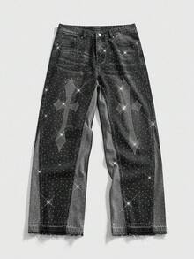 Grunge Punk Men's Fashion Color Block Rhinestone Embellished Jeans