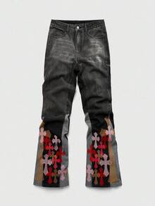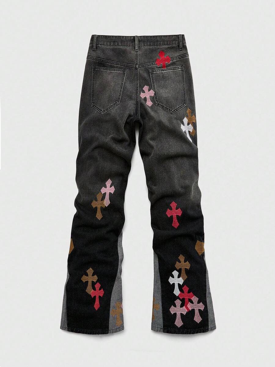 Grunge Punk Men's Fashionable Retro Cross Contrast Color Patchwork Cross Embroidery Denim Jeans