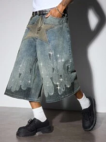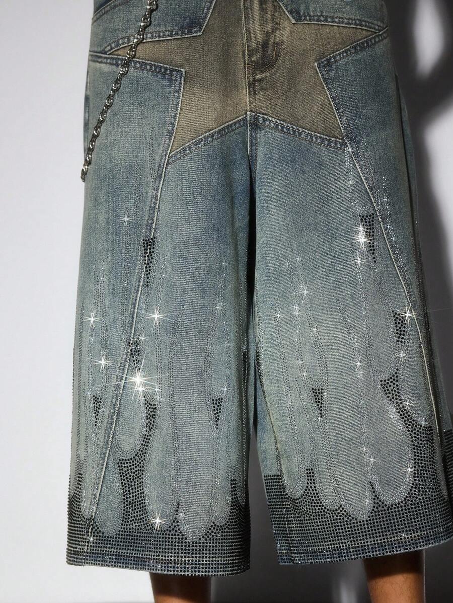Grunge Punk Men's Five-Pointed Star & Flame Rhinestone Decor 3/4 Shorts, Suitable For Everyday Wear In Spring/Summer