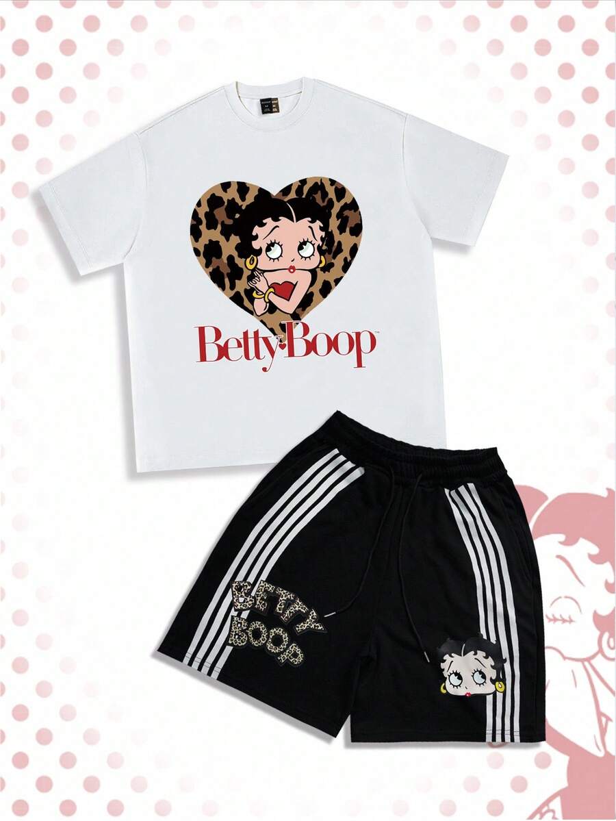 Betty Boop | ROMWE Men's Leopard Cartoon Figure Graphic Short Sleeve T-Shirt And Striped Print Shorts Set