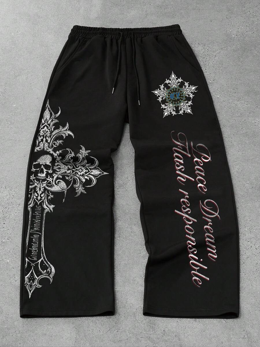 Men's Loose Comfortable Skull Sports Straight Leg Sweatpants, Black