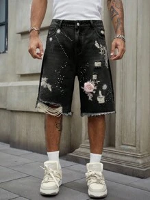 Street Life Men's Loose Fit Rhinestone Floral Embellished Denim Shorts
