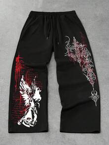 Goth Men's Loose Fit Straight Leg Sweatpants With Dark Floral Pattern, Comfortable Sports Pants