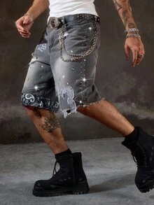 Street Life Men's Pockets Rhinestone Decor Patchwork Cashew Pattern Bermuda Denim Shorts