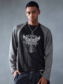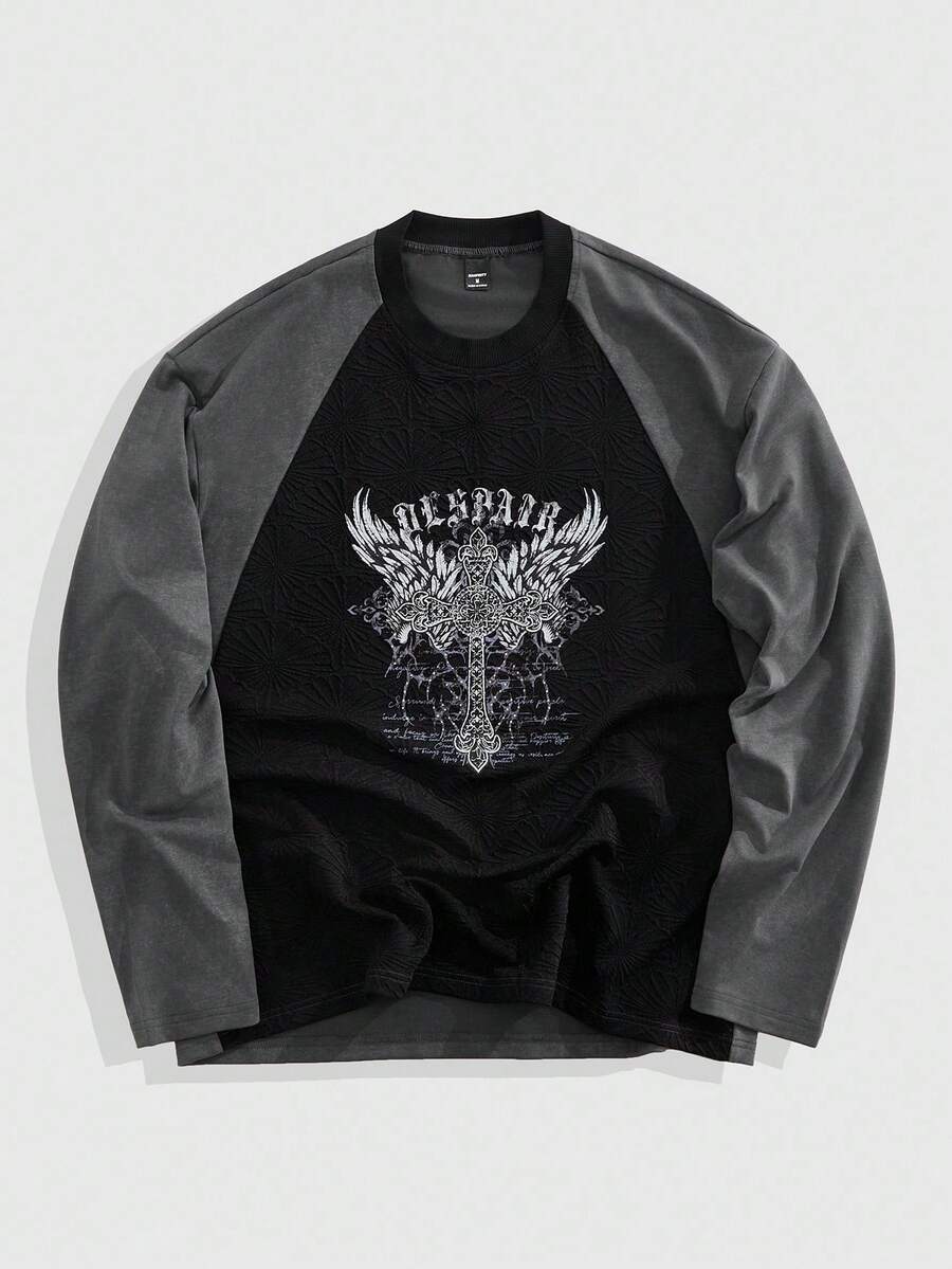 Street Life Men's Round Neck Wing Cross Print Patchwork Pullover Contrast Color Raglan Long Sleeve Casual Sweatshirt, For Fall