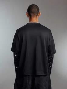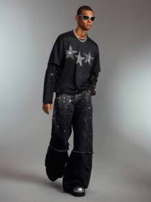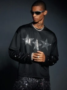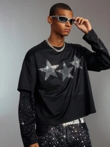 Street Life Men's Sparkling Star Diamond Decor 2 In 1 Long Sleeve T-Shirt, Fall, 2000s Style