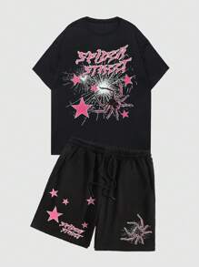 Street Life Men's Spider Stars And Letter Printed Short Sleeve T-Shirt And Shorts Set, Halloween