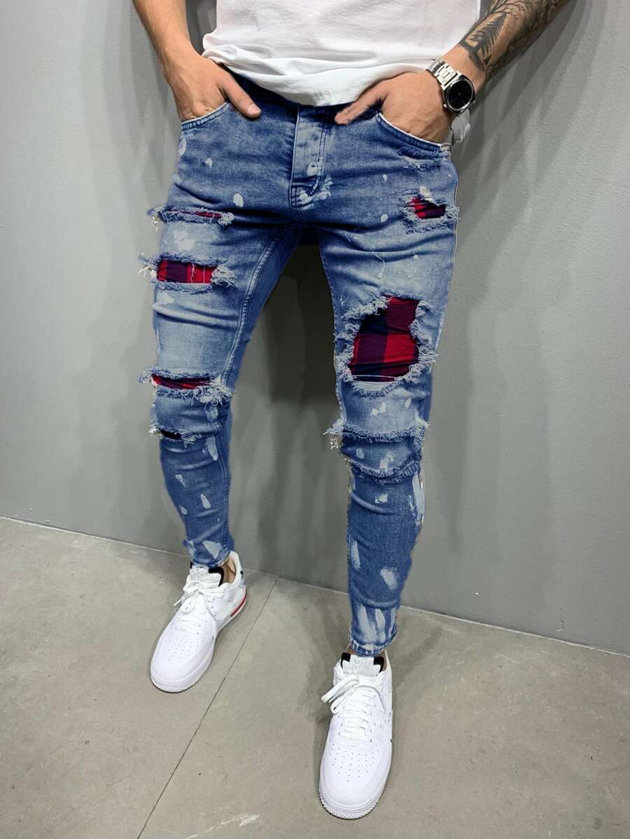 Men Cotton Contrast Plaid Ripped Jeans