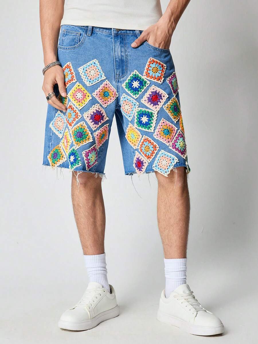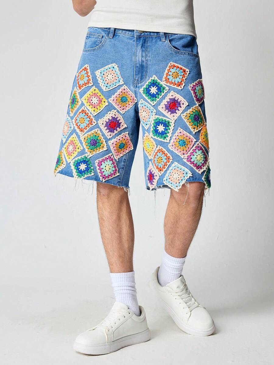Men Floral Pattern Frayed Hem Loose Casual Denim Shorts, Vacation