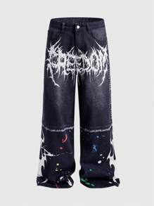 Men Gothic Letter Graphic Pocket Wide Leg Loose Casual Jeans