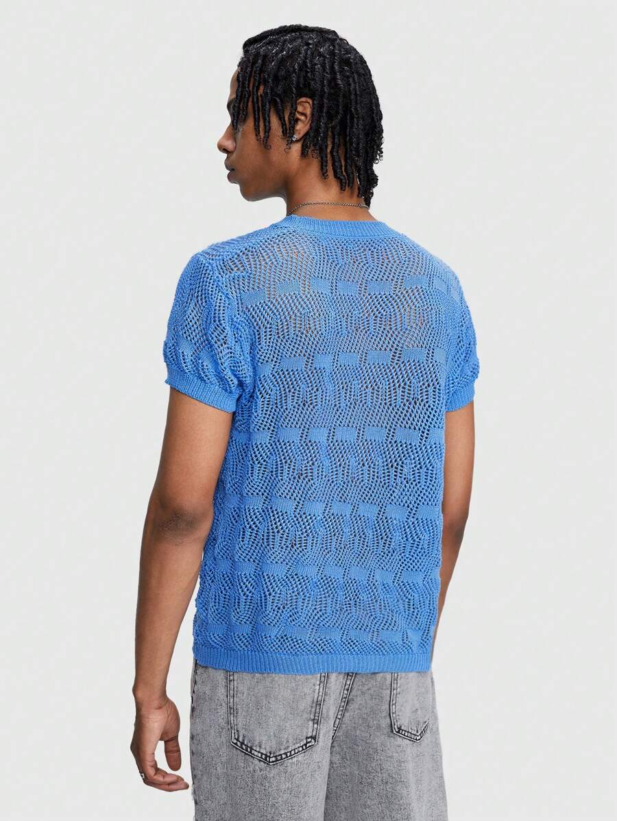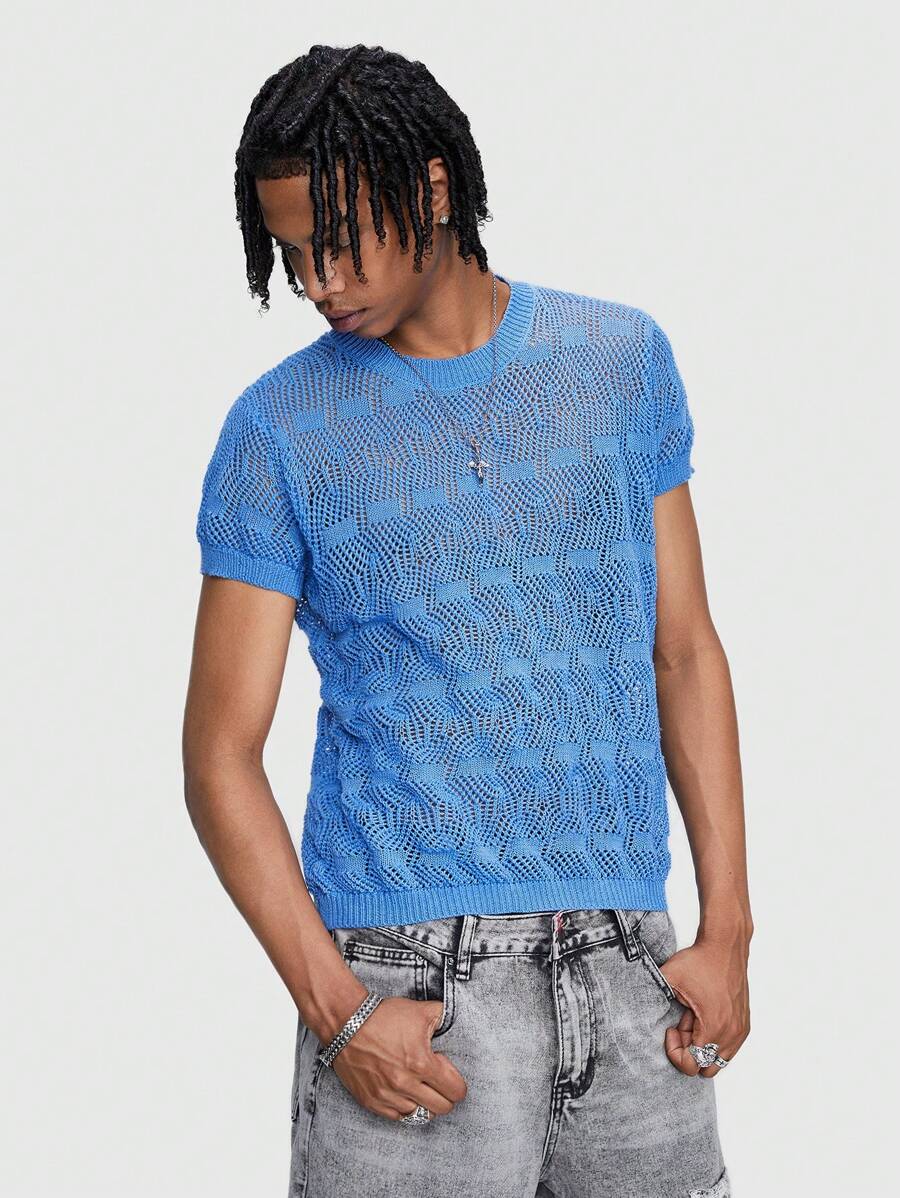 Men Solid Color Short Sleeve Hollow Knitted Top For Spring And Summer