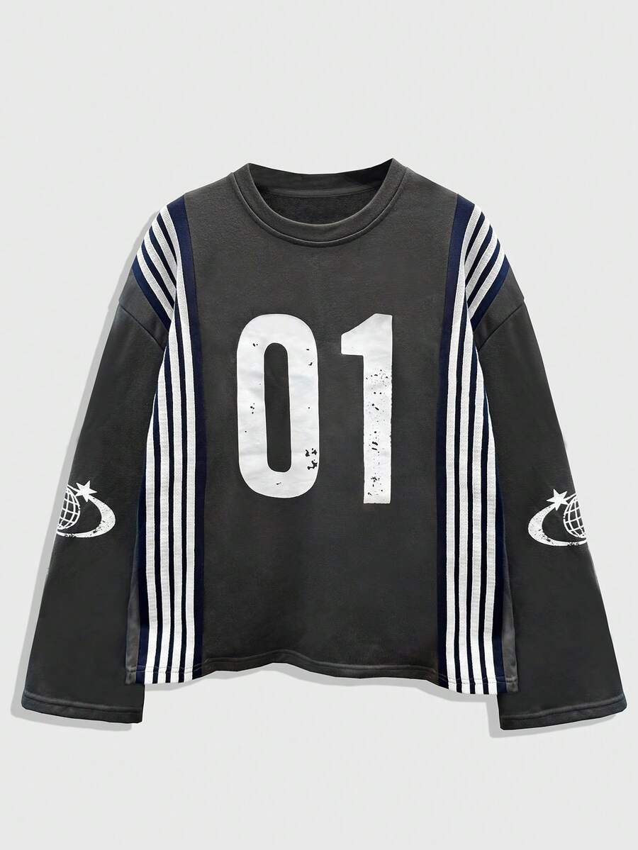 Men's Casual Numeric & Striped Print Round Neck Long Sleeve T-Shirt