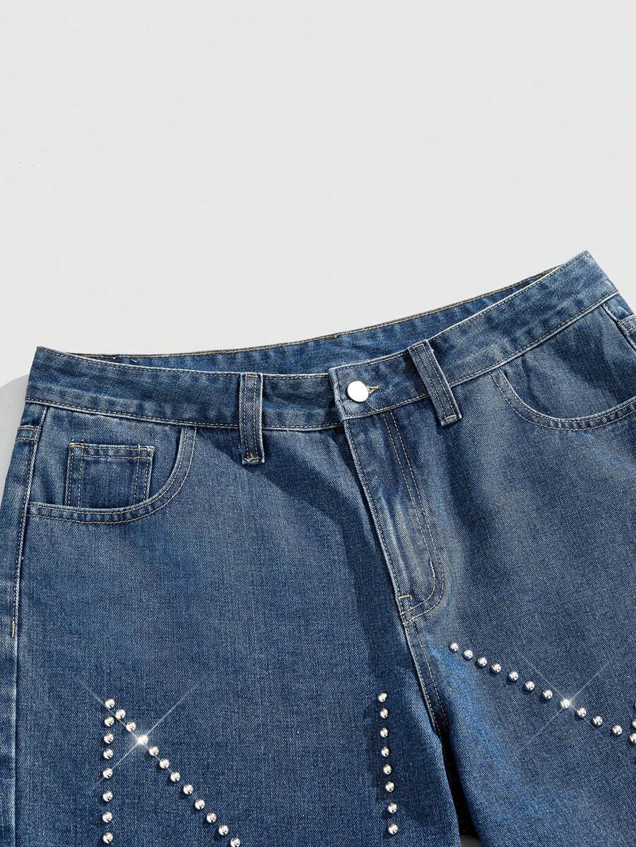 Men's Casual Summer Rhinestone Letter Studded Blue Denim Shorts