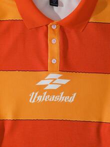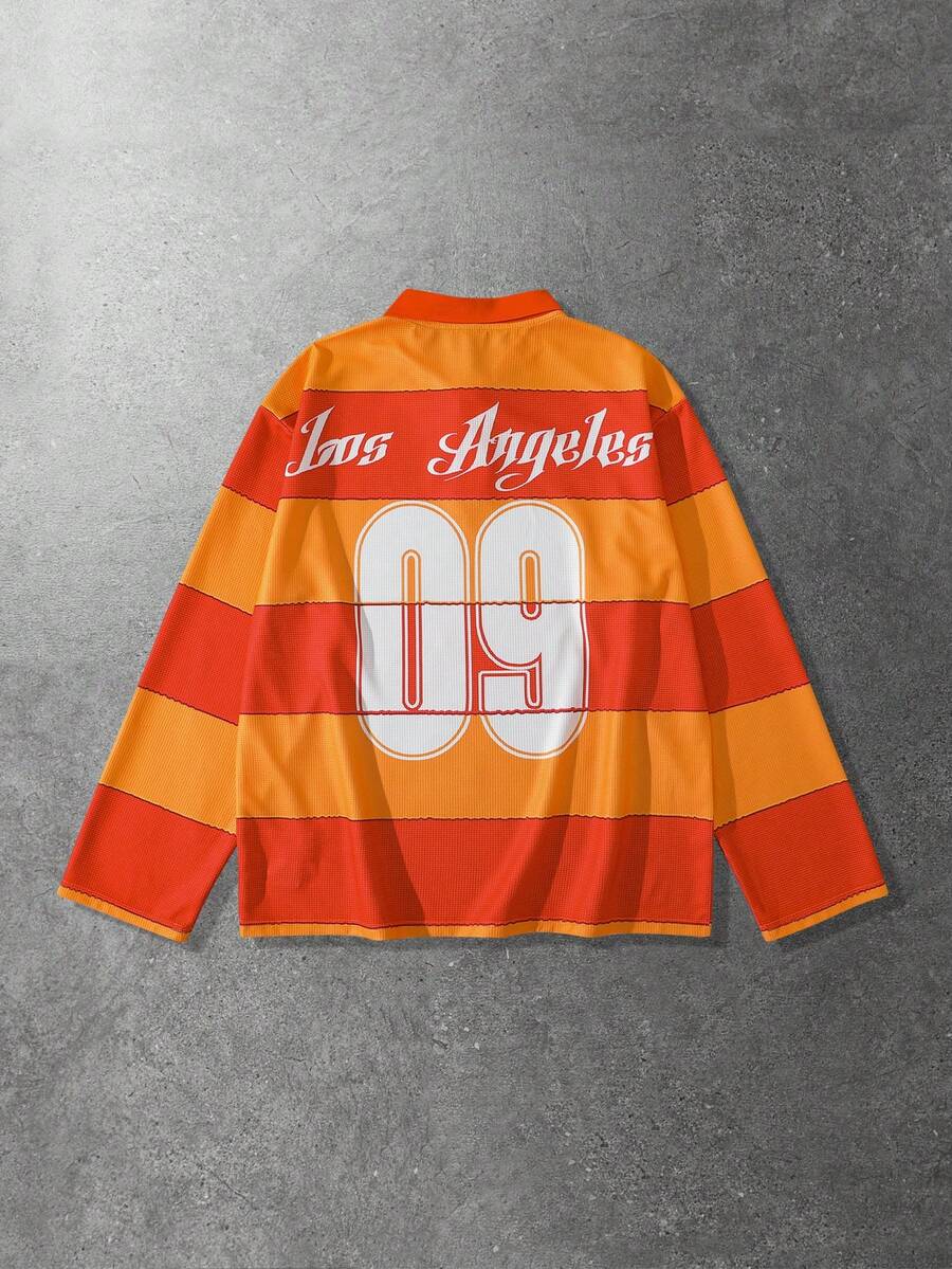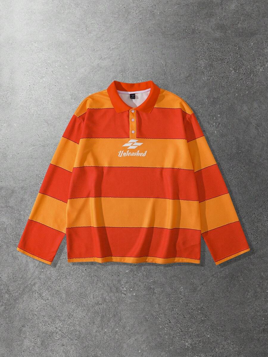 Men's Letter Print Preppy Striped Loose Polo Collar Casual Long Sleeve T-Shirt