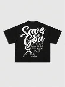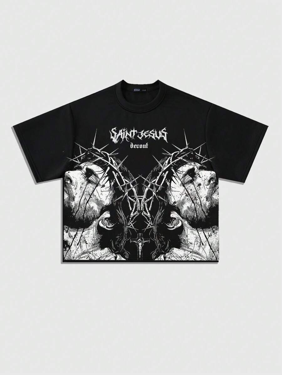 Street Life Men's Gothic Figure Loose Fit Drop Shoulder Short Sleeve Punk Style Printed T-Shirt, Vintage Street Style, Halloween