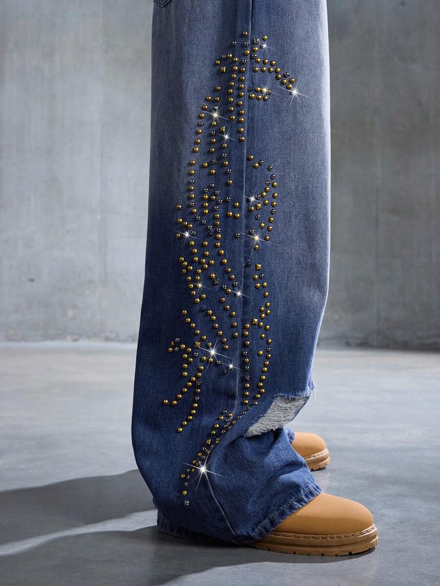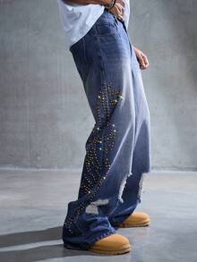 Men's Pocket Distressed Studded Wide Leg Casual Jeans