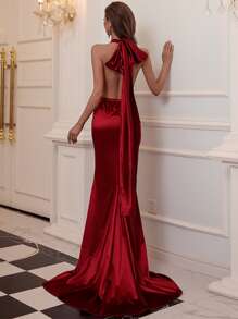 Missord Self Tie Plunging Halterneck Fishtail Satin Prom Dress