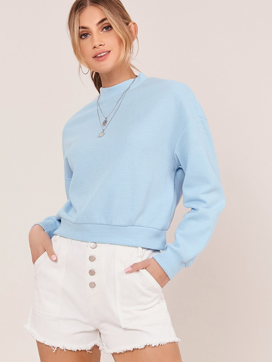 Mock Neck Waffle Knit Pullover,Long Sleeve Tops In Fall/Winter