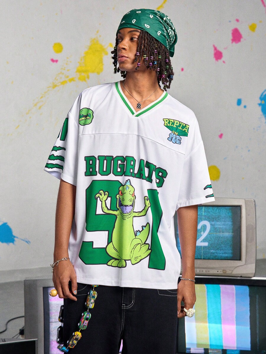 Nick 90's X ROMWE Men's V-Neck Cartoon & Letter Graphic Short Sleeve T-Shirt, Summer