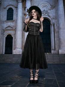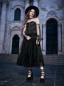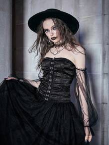 Off Shoulder Hook And Eye Contrast Mesh Crop Top Gothic