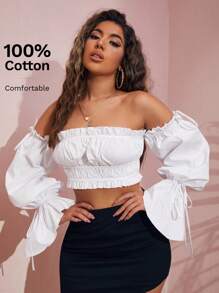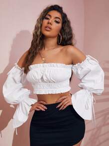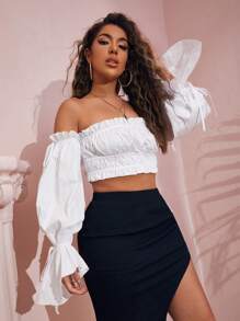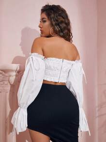 Off Shoulder Ruffle Trim Knot Sleeve Top