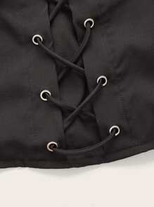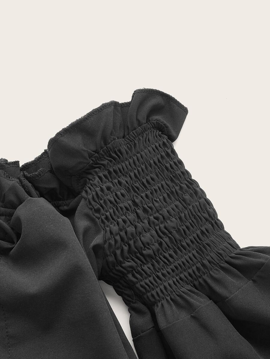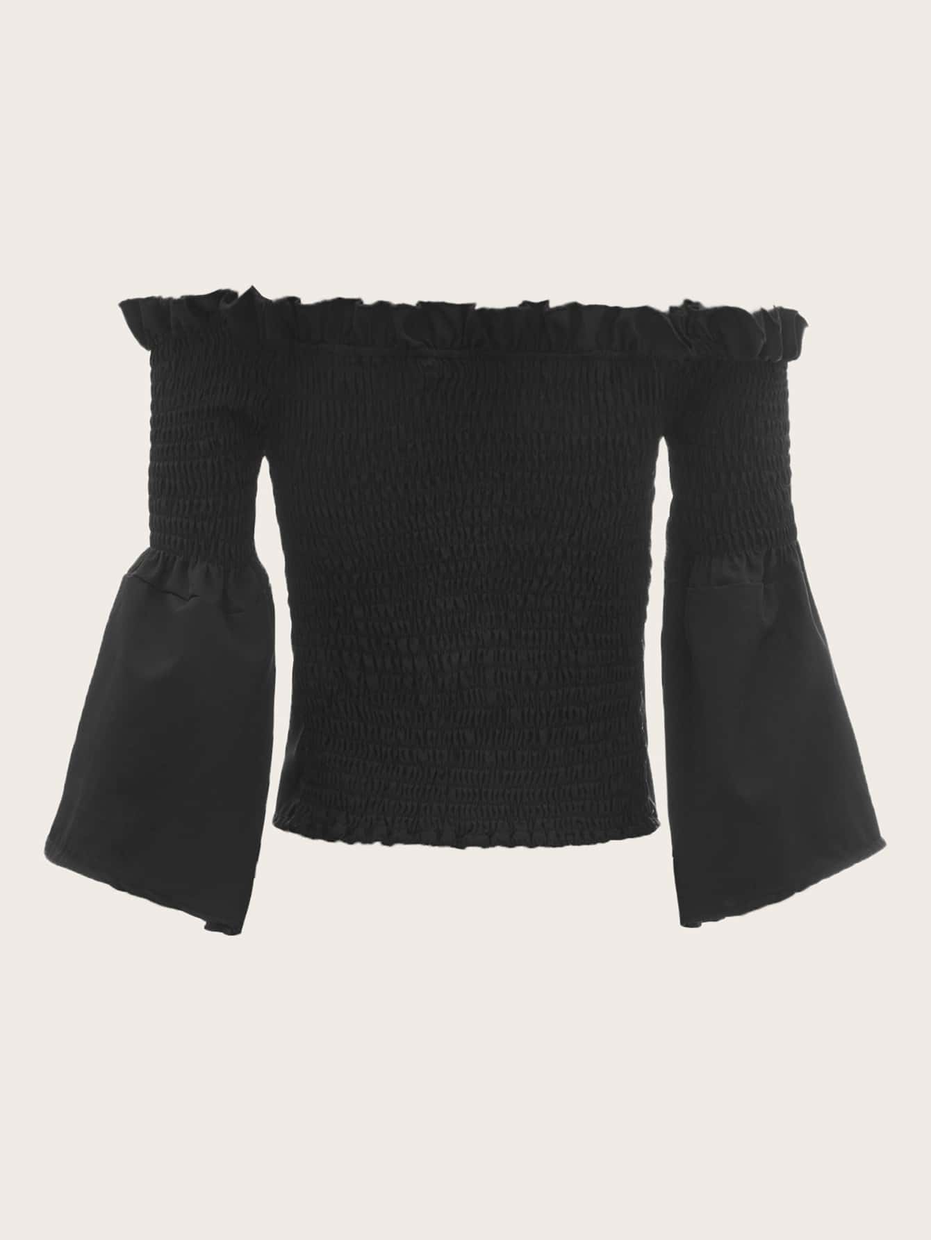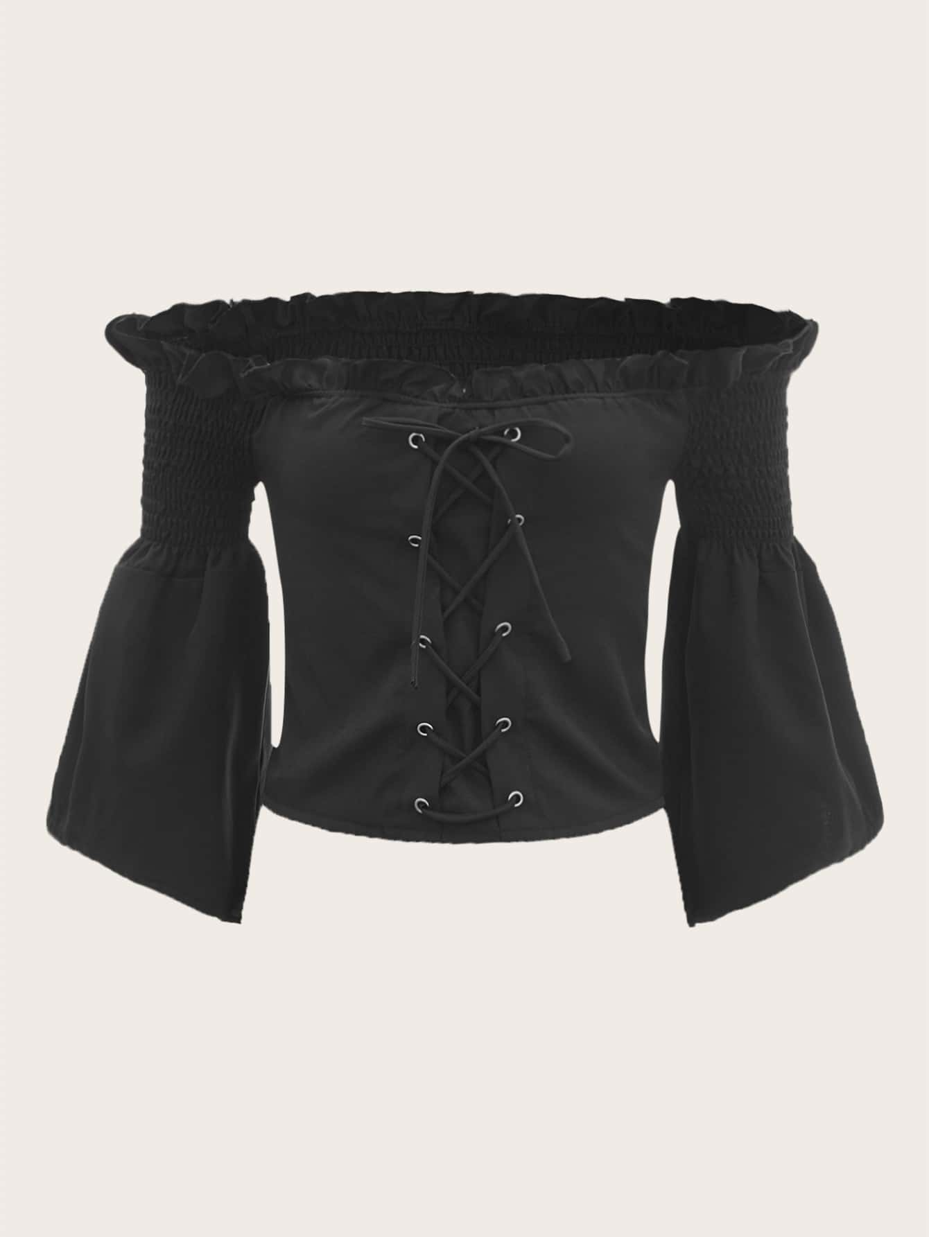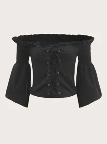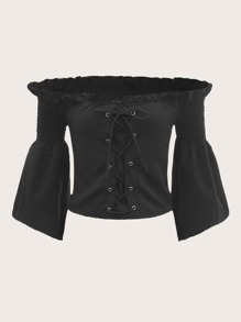 Off The Shoulder Lace Up Shirred Flounce Sleeve Blouse