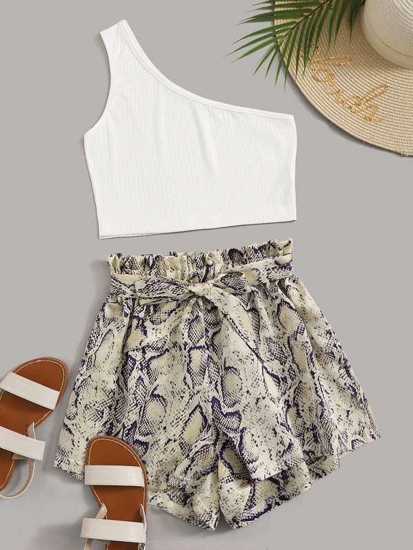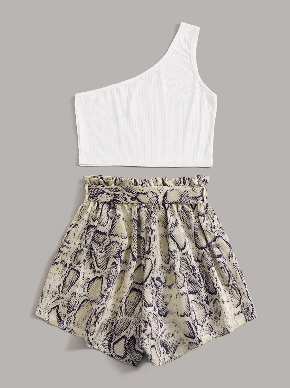 One Shoulder Top & Snakeskin Print Belted Shorts