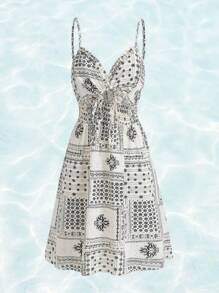 Fairycore Paisley Print Tie Front Shirred Cami Dress