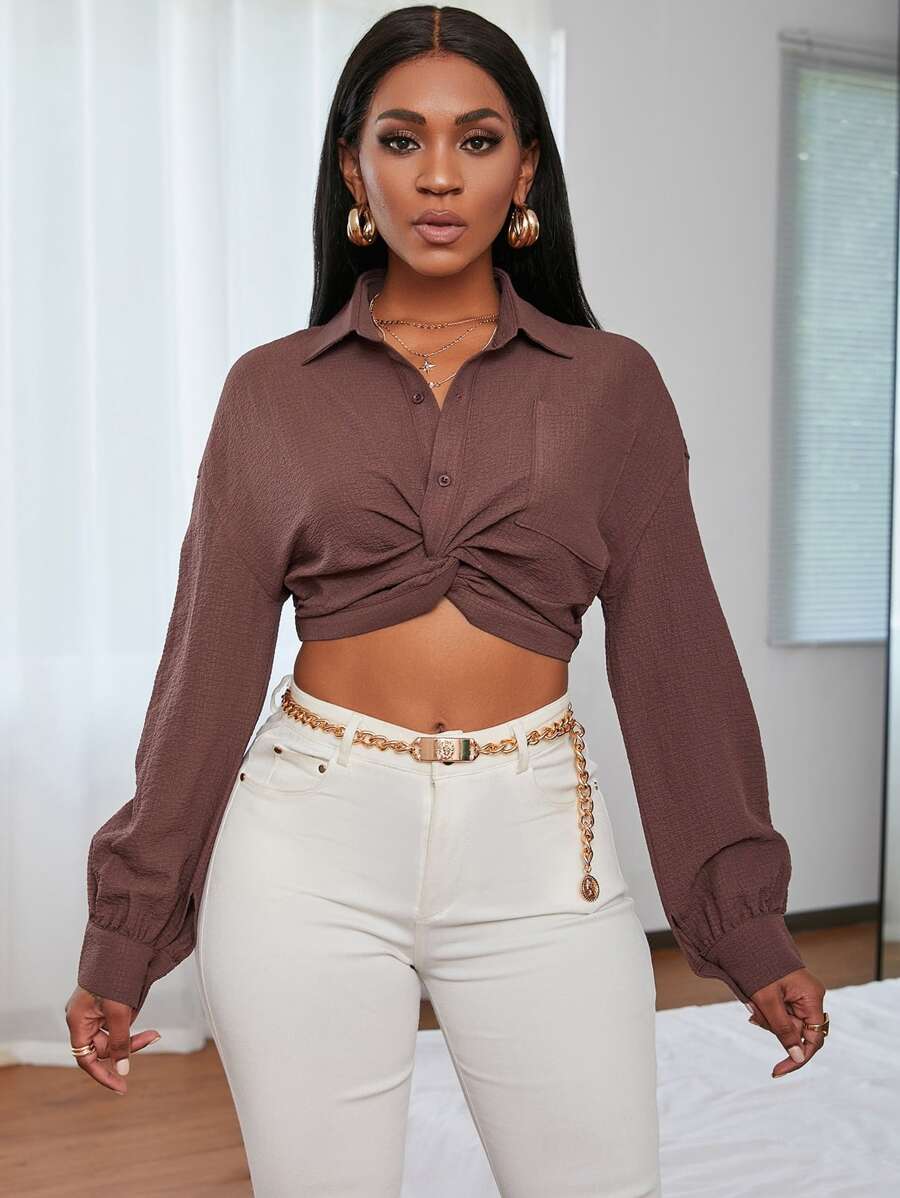 Patched Pocket Twist Front Crop Blouse Fall Cloth For Women
