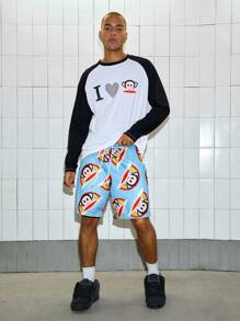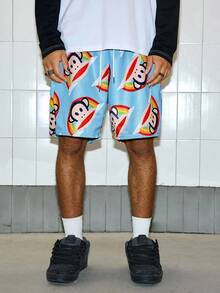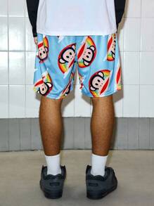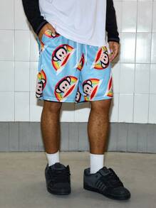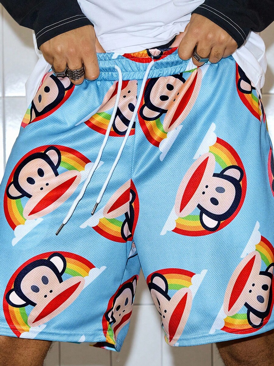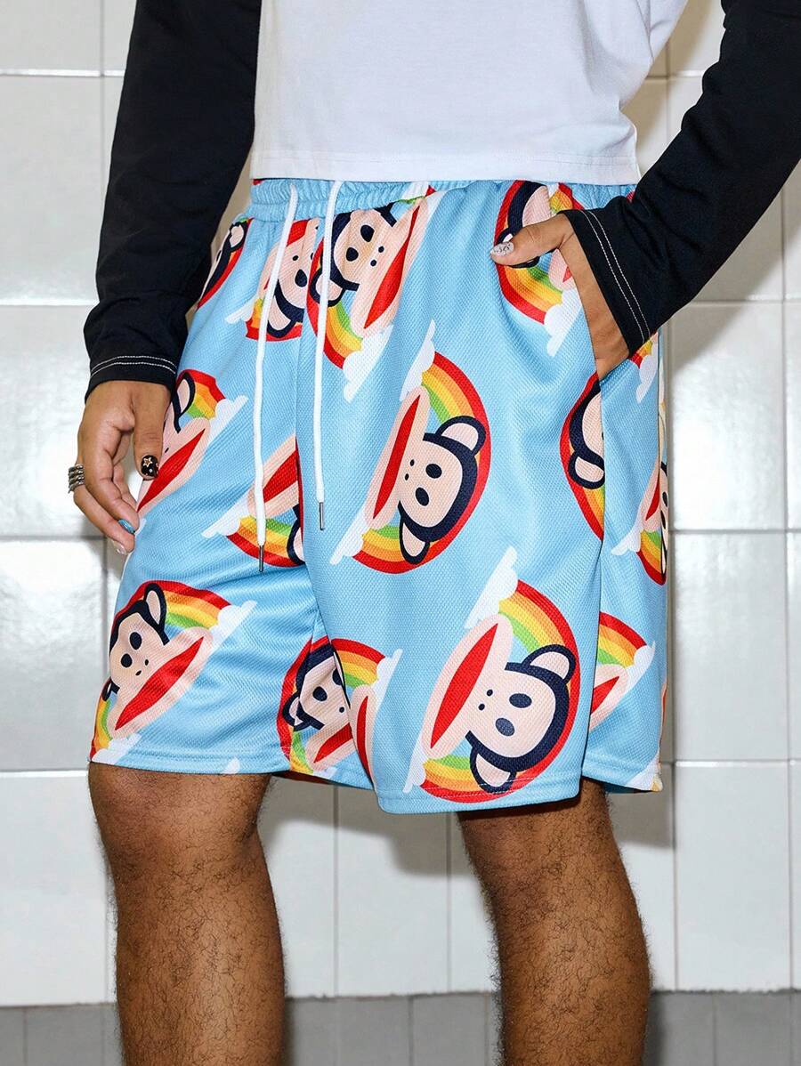 Paul Frank X ROMWE Men's Summer Casual Street Rainbow & Cartoon Pattern Drawstring Waist Slant Pocket Loose Shorts