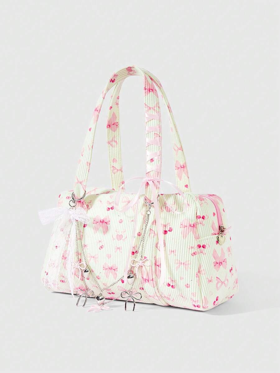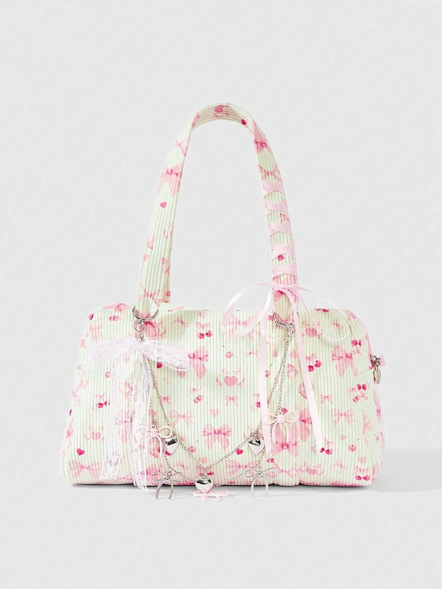 Kawaii Pink Corduroy Bow Fashion Tote Bag, Women Handbag With Bow & Heart Print, Cute Bow Bag For Women, Perfectly Matching With Fall Outfits Women