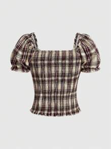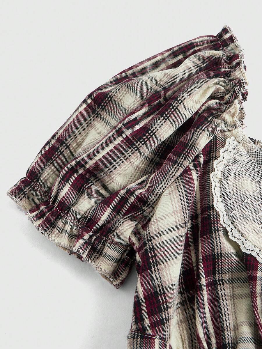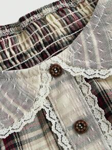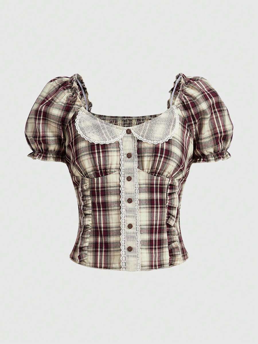 Kawaii Plaid Print Lace Trim Puff Sleeve Blouse