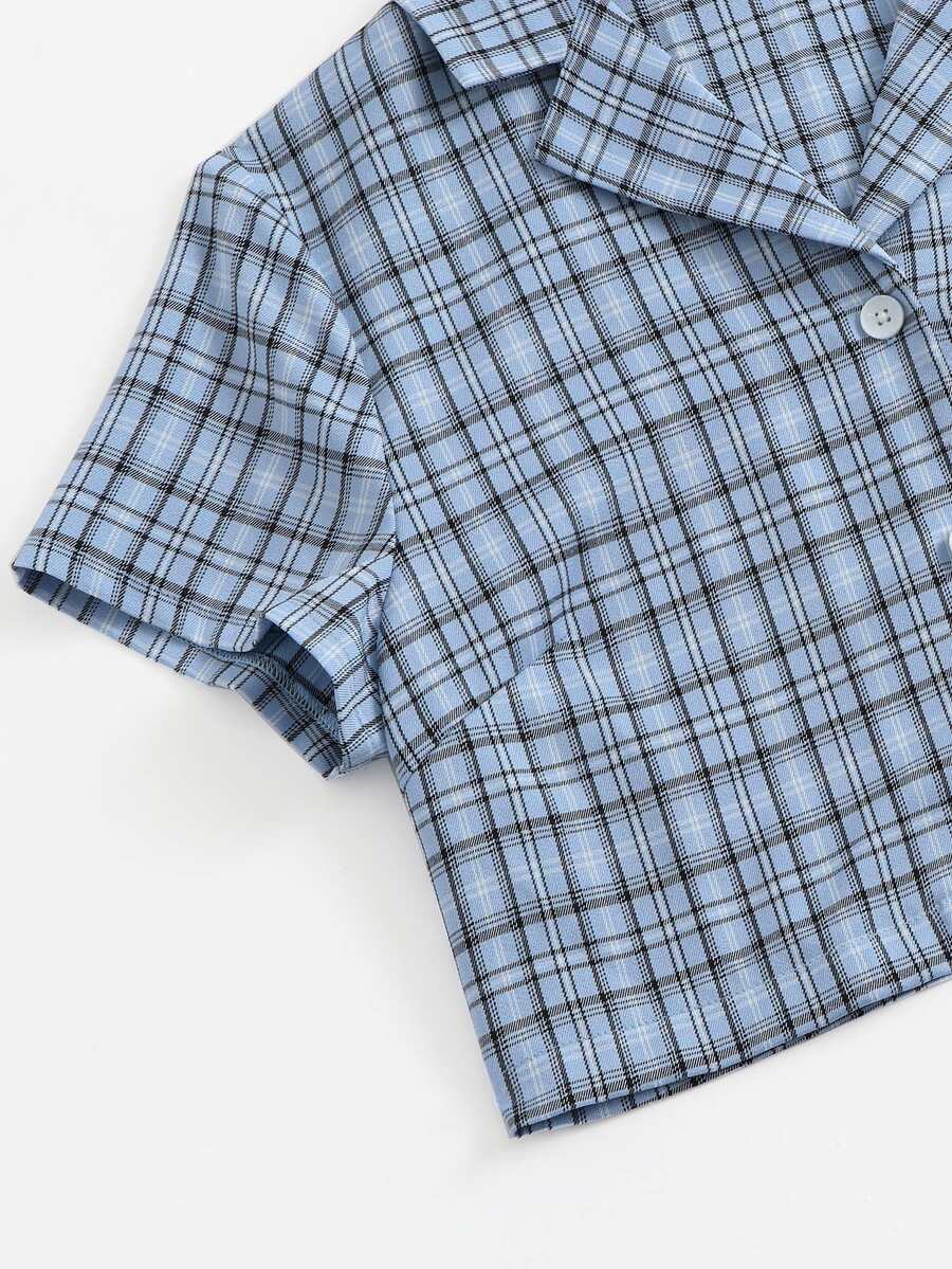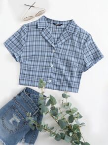 Plaid Print Lapel Neck Crop Blouse